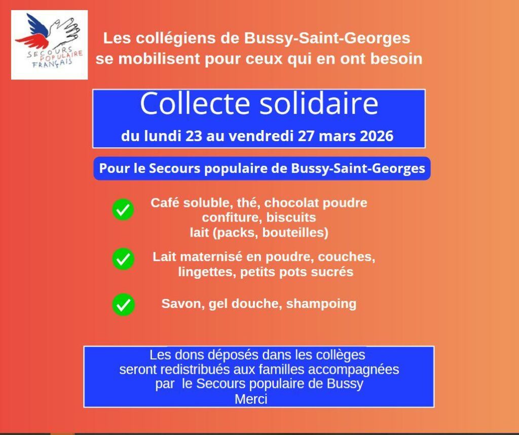 Collecte solidaire pour le Secours Populaire de Admin | 16 mars 2026 - 12h30 |16 mars 2026 Non classé Le collège Claude Monet va participer à la collecte solidaire pour le Secours Populaire. Pour marque-pages : Permalien.